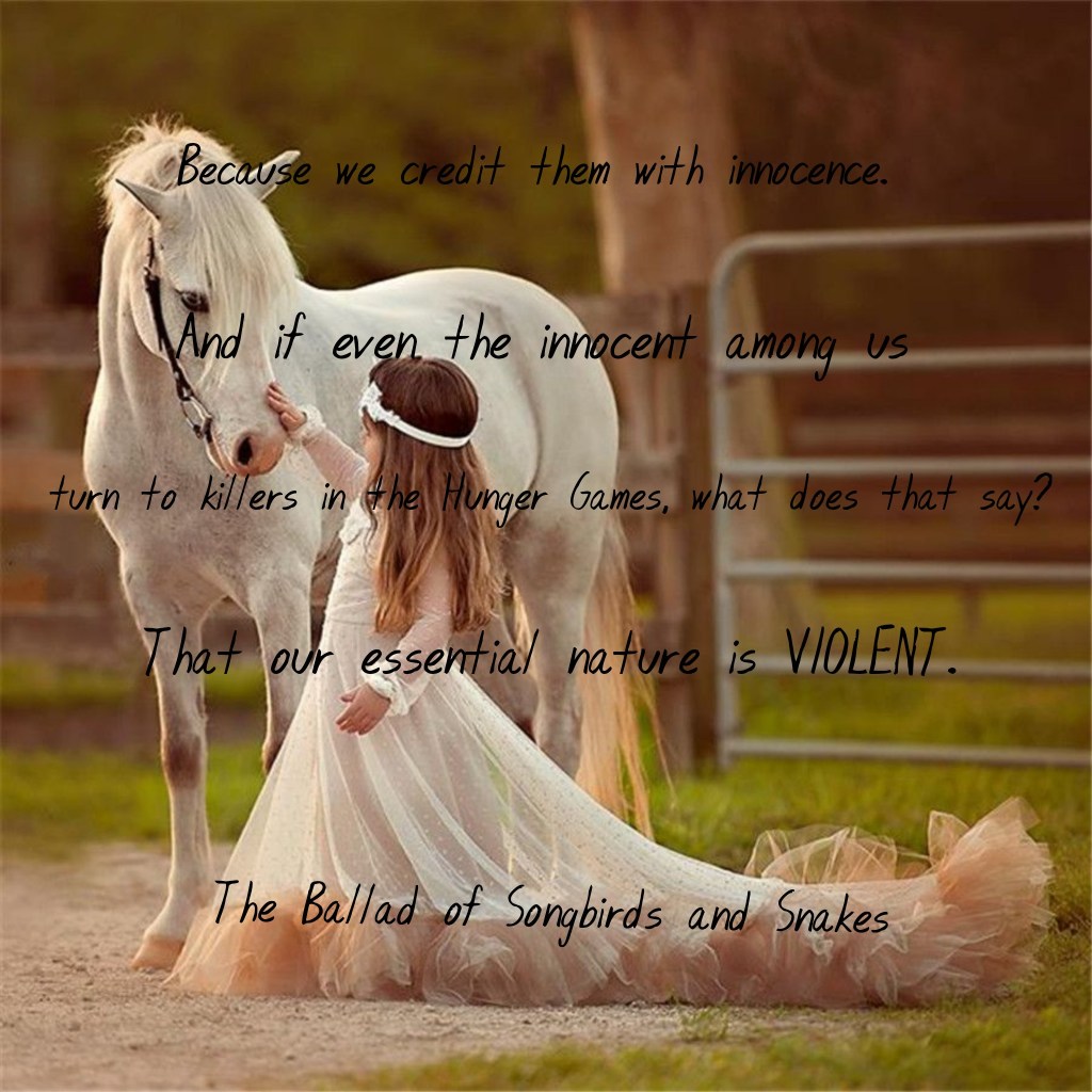 What makes this story so fascinating to me was that there are two Hunger Games going down during this novel. We have the tributes fighting in the arena for their lives and Coriolanus and his schoolmates fighting for a chance at a better life. Collins shows you what desperate people can do even if it’s not a life-or-death scenario but a struggle for pride. Coriolanus wants to be respected and wants power. As we watch the plot unfold, we see how far he is willing to go to get it. To add to the desire to restore pride, we also see a violent bent in practically every character. Throughout this novel, we are shown again and again that violence is a part of the human condition, like the desire for pride and prestige. It’s in our blood and unfortunately, we have to fight against it. Even the ones we call innocent, children, are this way.