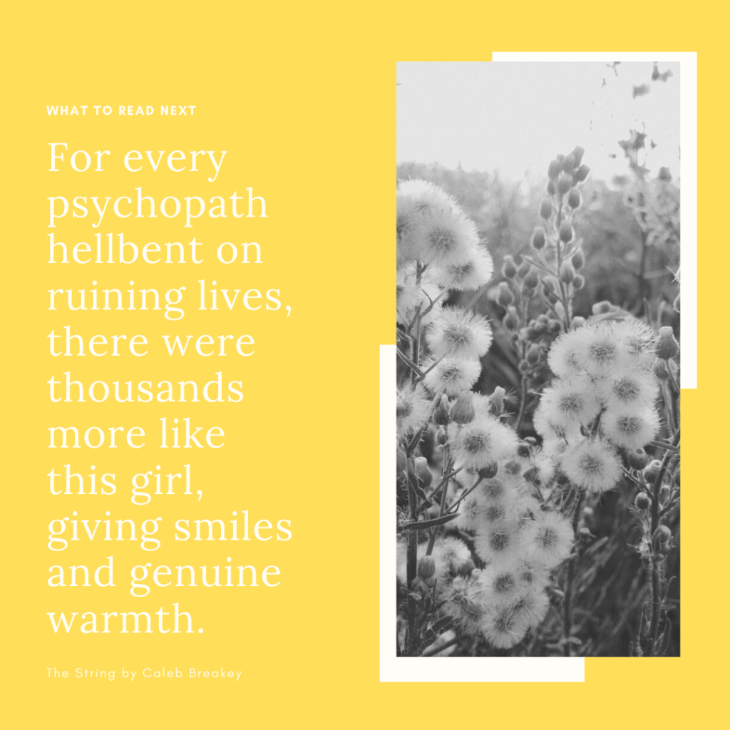 Despite the fact I enjoyed this novel, The String has far too many characters. In the end, it is revealed who the antagonist is, however, because there are so many characters I struggled to remember who that person was and why they mattered! I think if Breakey would have brought the character into the spotlight more frequently I would have been totally on board but I had to jog my memory on who this person was. This totally took away from the shock factor-for me- and I read it in about 10 days! I think I should’ve have known exactly who it was.